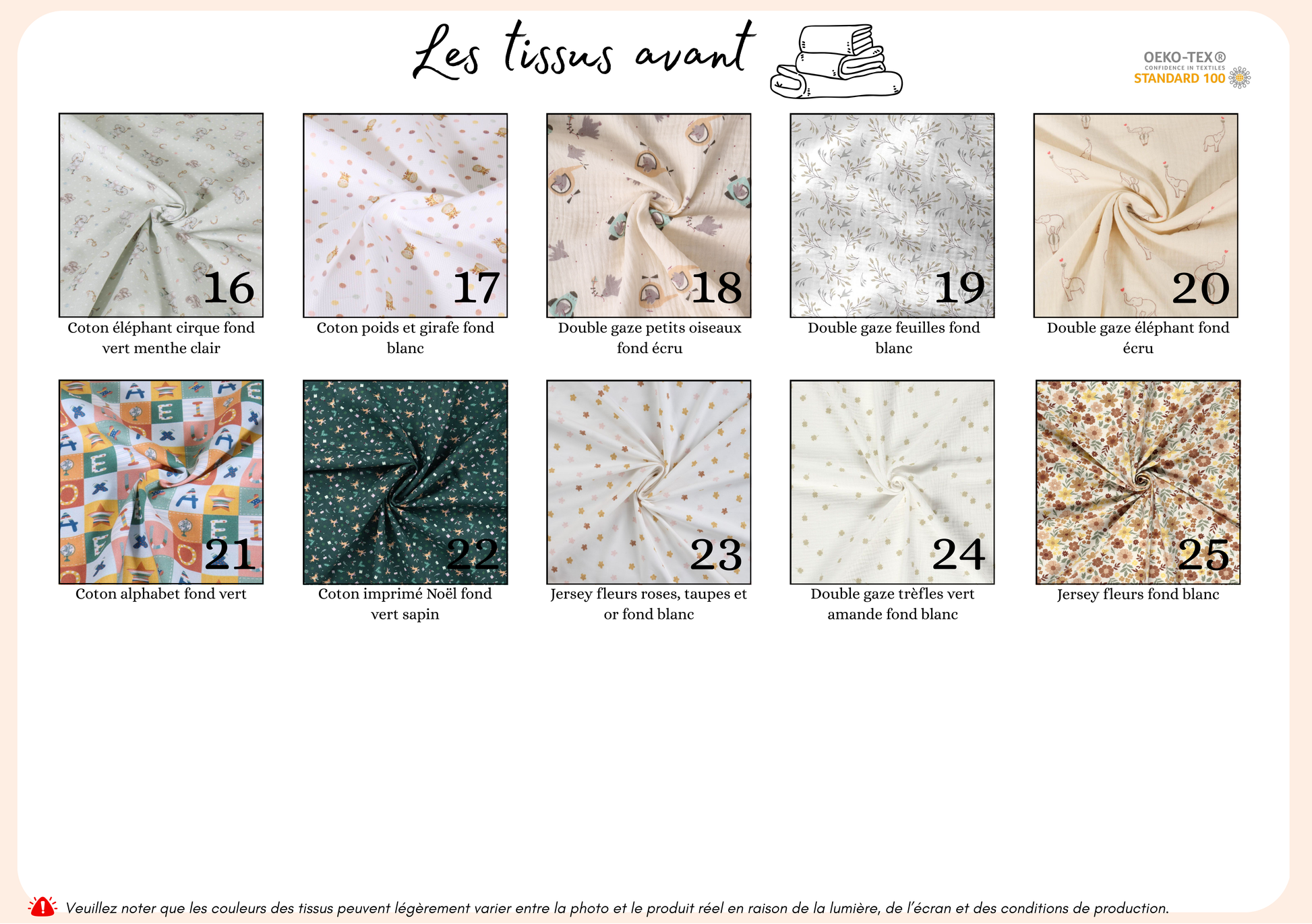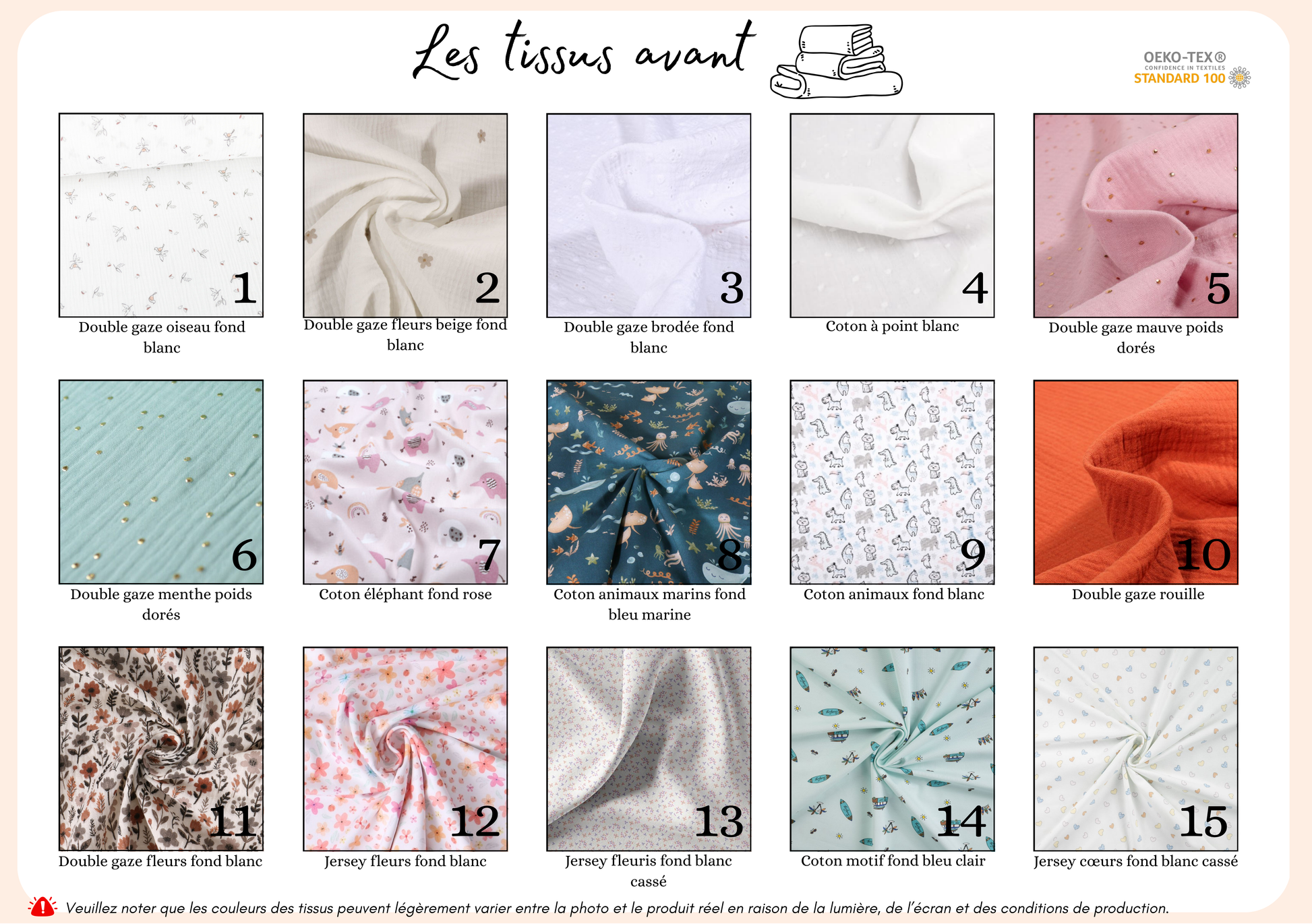 Chaque Doudou est personnalisable, vous pouvez également choisir les coloris de mon modèle en choisissant " Couleur de la tête 173, Tissus avant 8, Tissus arrière J "