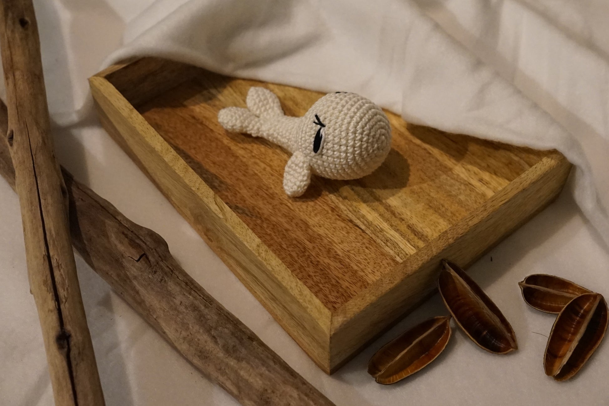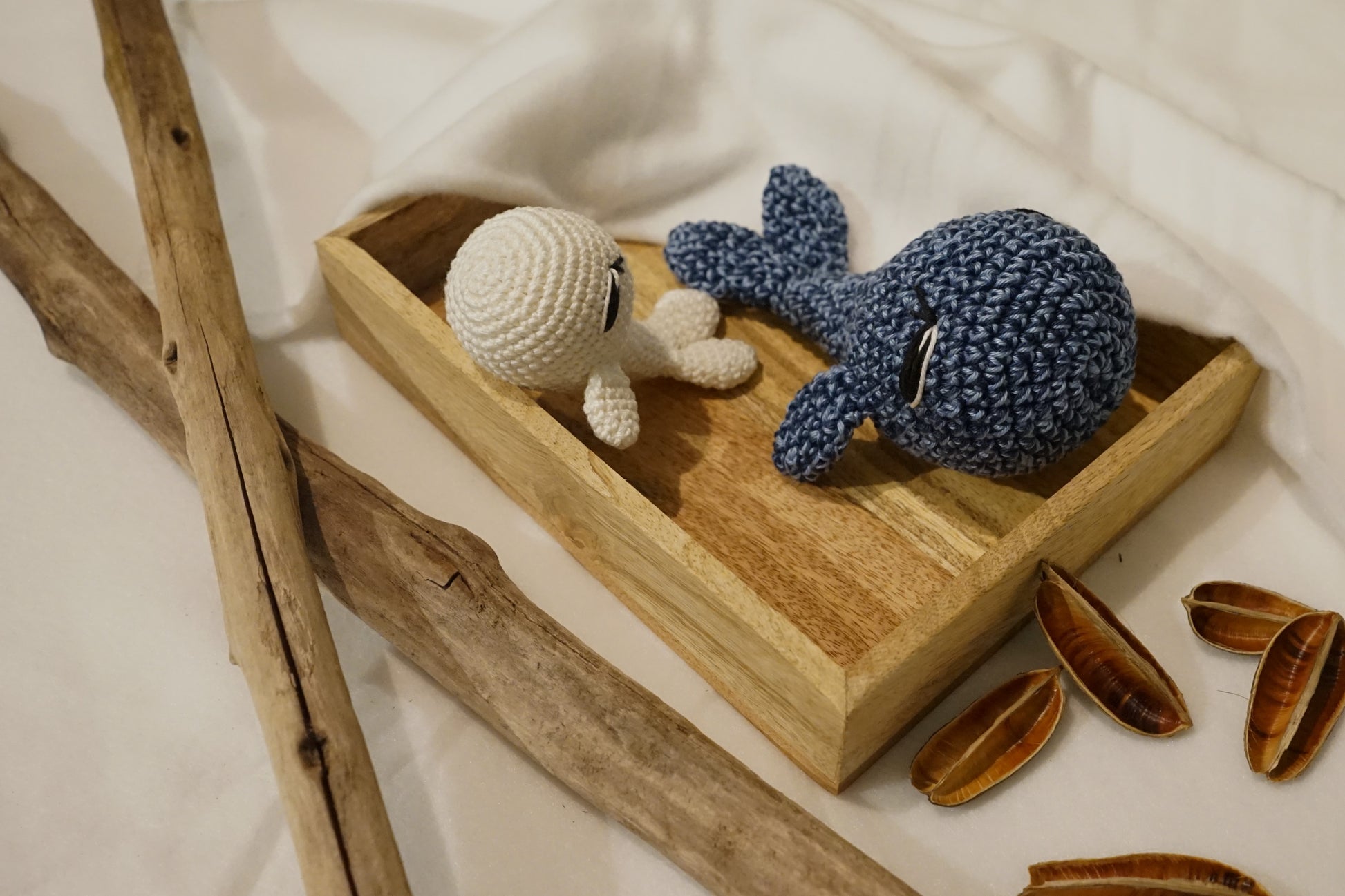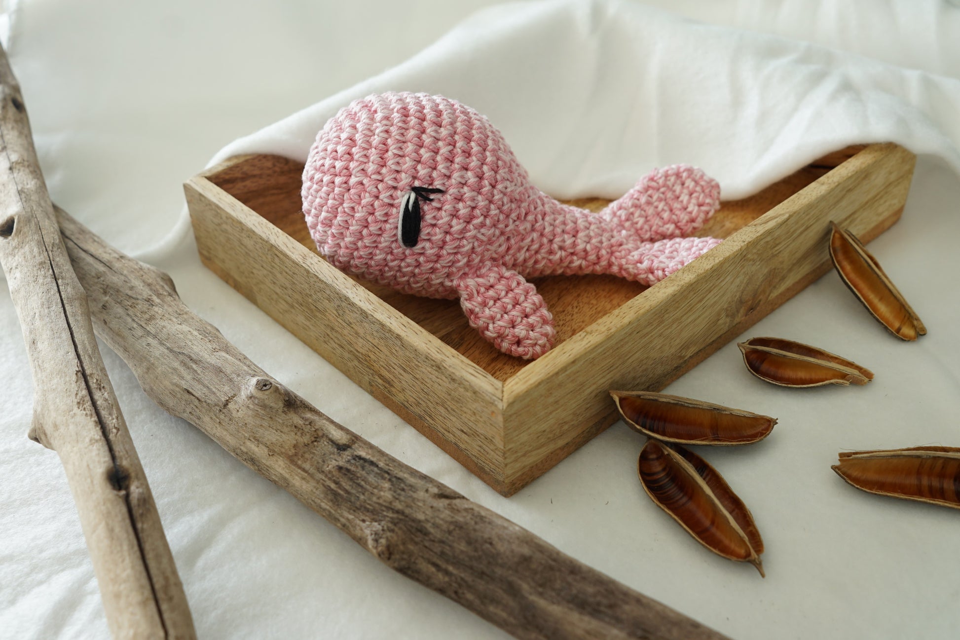 Baleine blanche : Crocheté avec un fil simple en coton, mesure environ 11 cm de long.