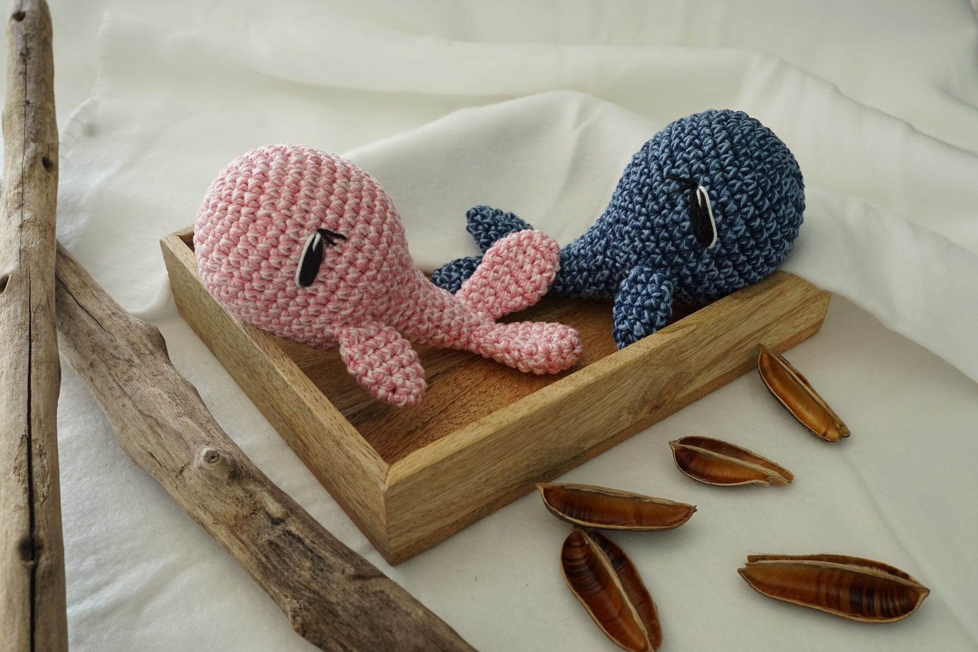 Baleine bleue ou rose : Crocheté avec un double fils en coton, mesure environ 17 cm de long.