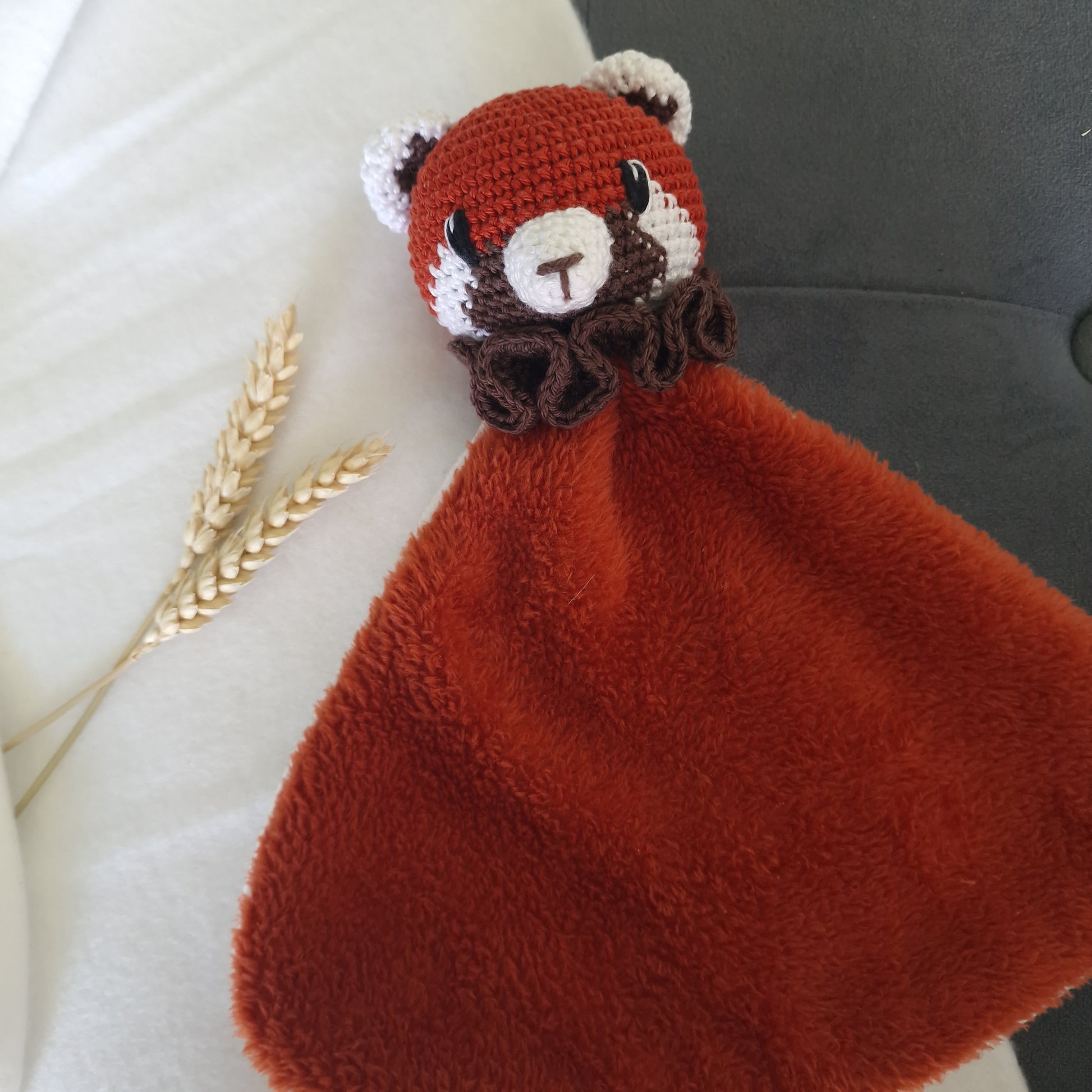 Ce panda roux et son lange unique est un ensemble fait à la main. La tête est crochetée avec un fil 100% coton, le lange arrondi mesure 18cm de hauteur et 23cm de largeur. Il est confectionné avec un tissu ultra doux.