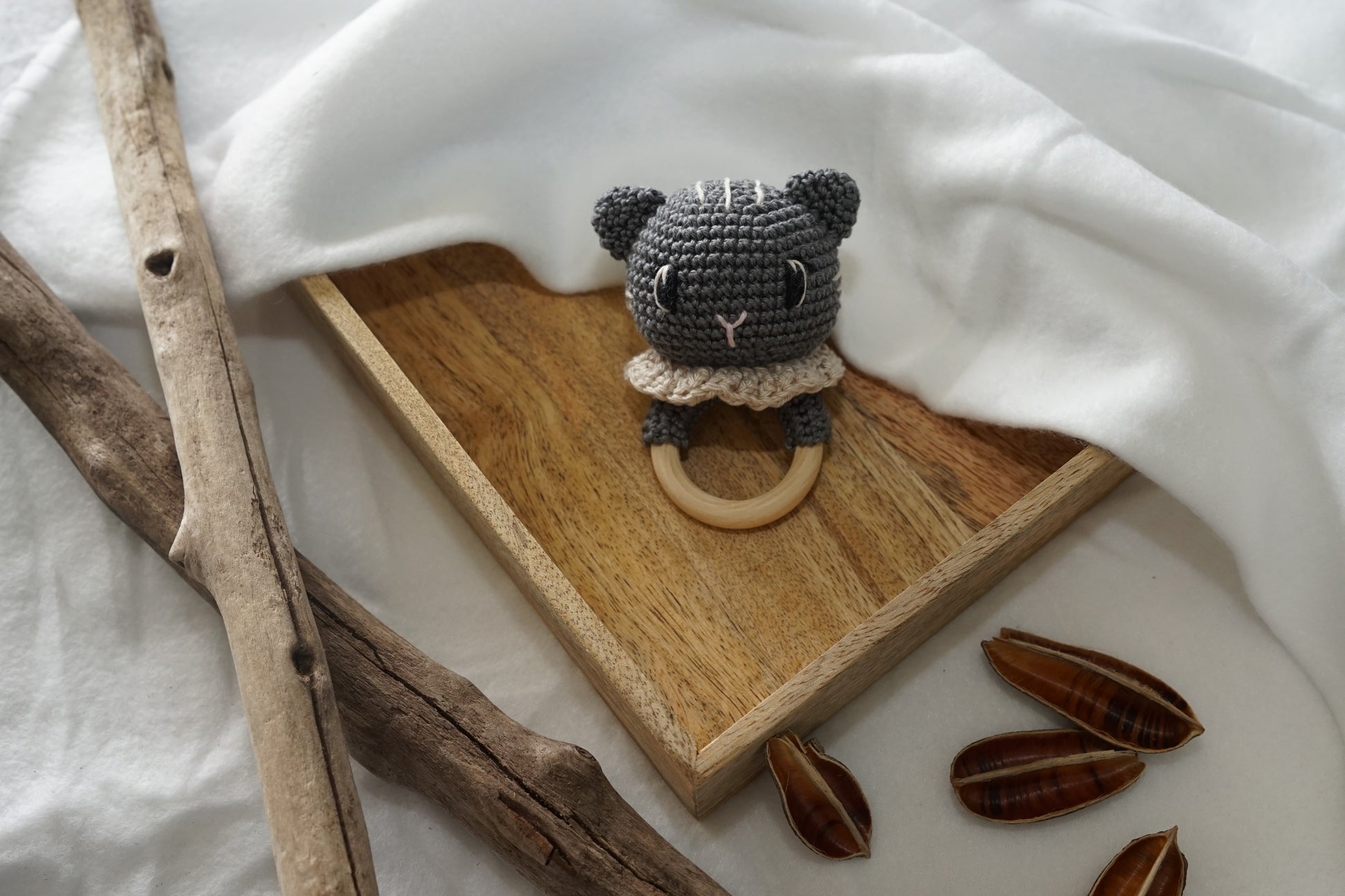 Hochet fabriqué entièrement à la main avec un fil Coton Oeko-Tex.