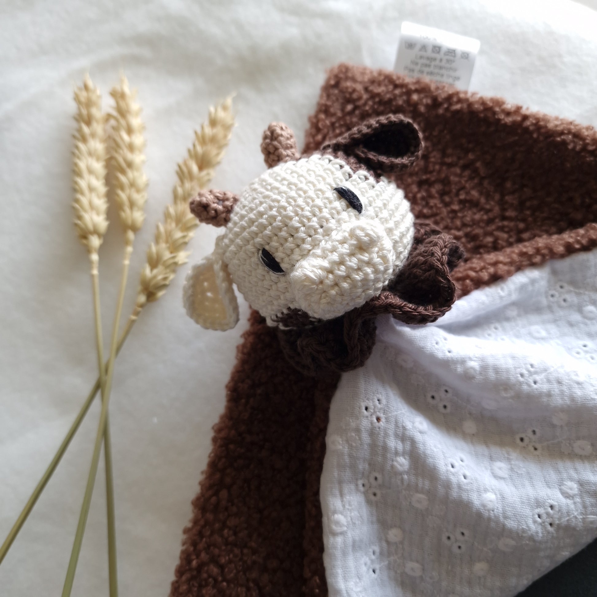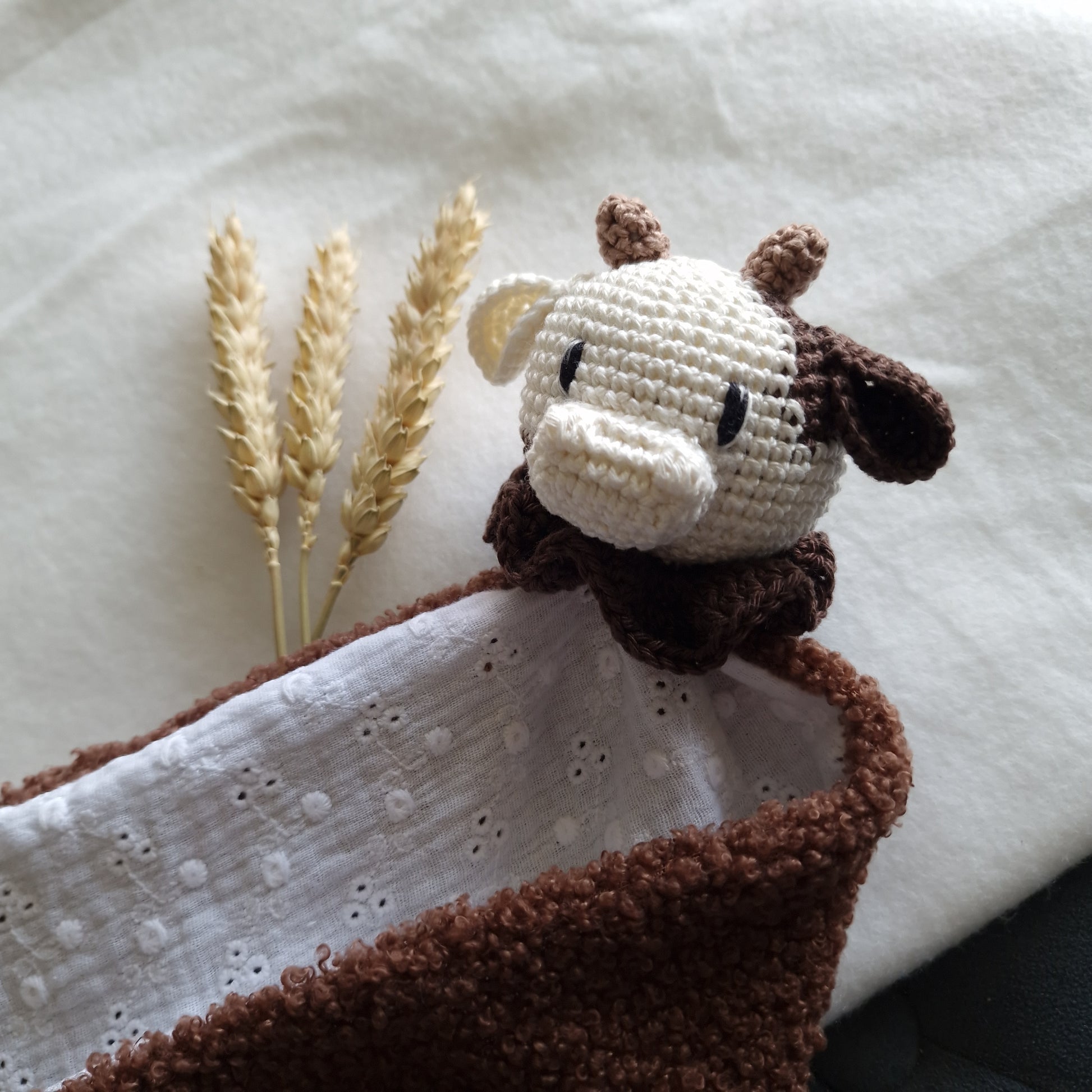 Cette petite vache est un ensemble fait à la main. La tête est crochetée avec un fil 100% coton, le lange est un carré d'environ 22x22cm, il est confectionné avec un double gaz de coton et un tissu ultra doux.