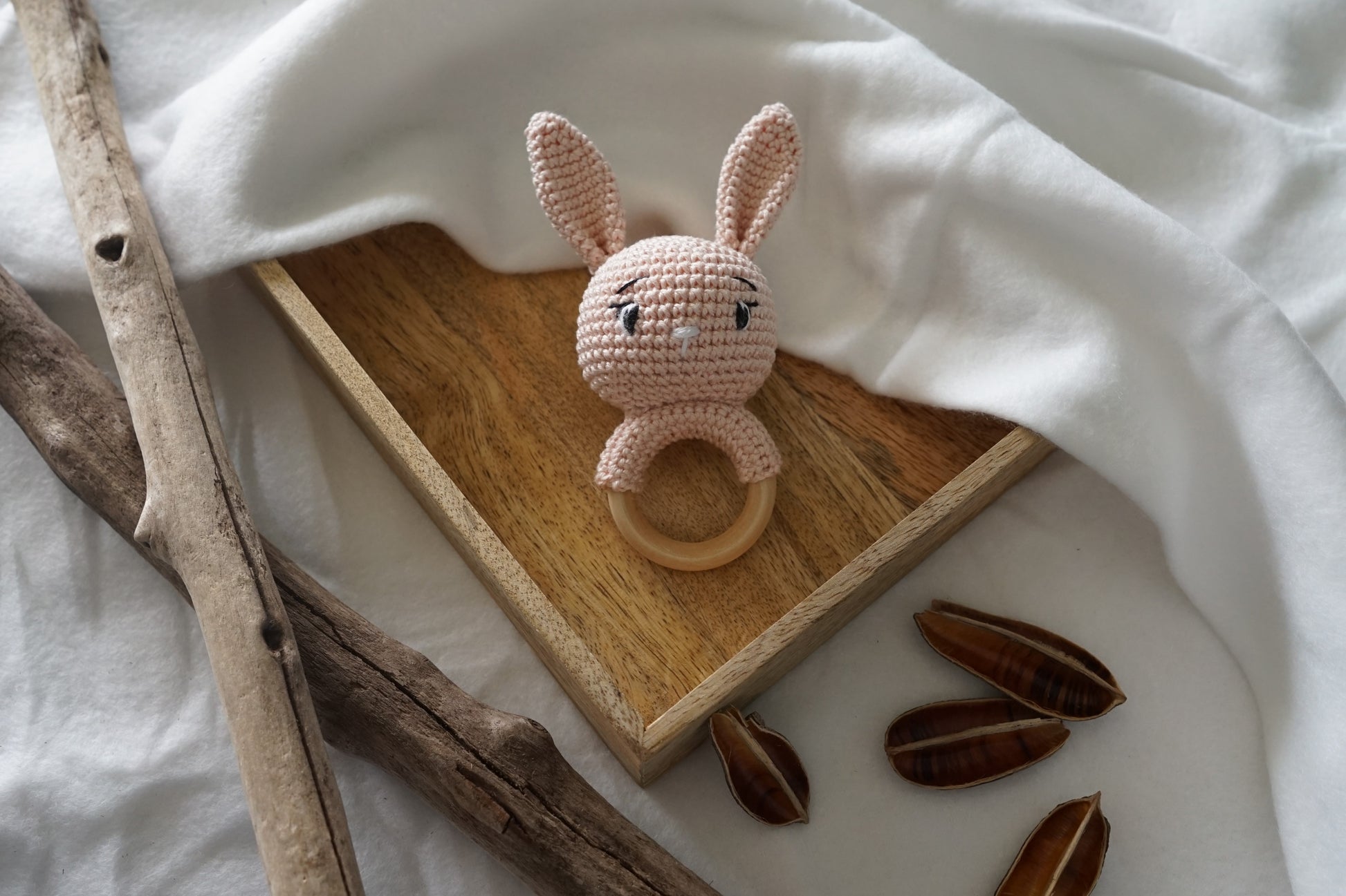 Hochet fabriqué entièrement à la main avec un fil Coton Oeko-Tex.