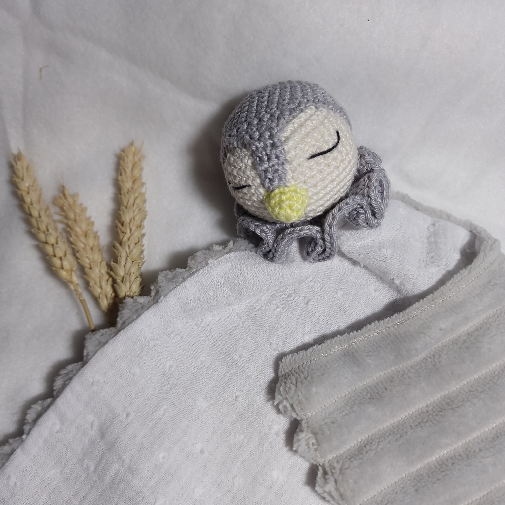 Ce doux Tino est un ensemble fait à la main. La tête est crochetée avec un fil 100% coton, le lange est un carré d'environ 22x22cm, il est confectionné avec un double gaz de coton et un tissu ultra doux.